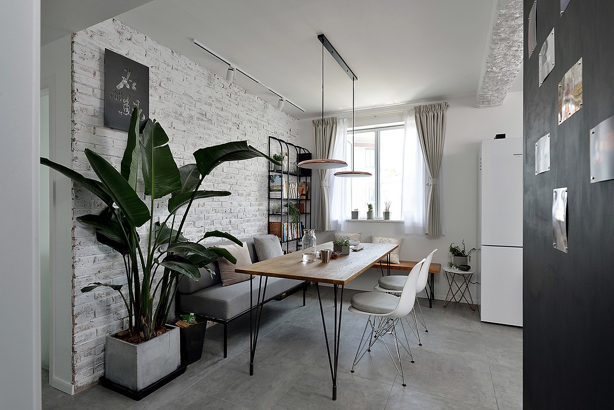 餐厅墙面做一部分文化砖艺术墙,靠窗的位置放置铁艺架子方便存储物品,同时也可以作为一个展示柜,放一些自己喜欢的小物件,十分实用。