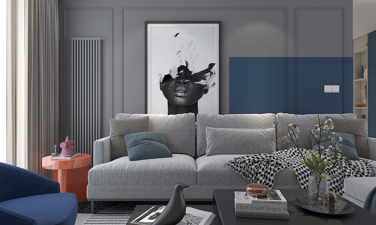 走进卧室,映入眼帘的是灰色床和蓝色墙面带来的强烈对比。衣帽间里是精致的“居居女孩”,衣帽间外是对生活充满了“狂想”的好奇女孩。