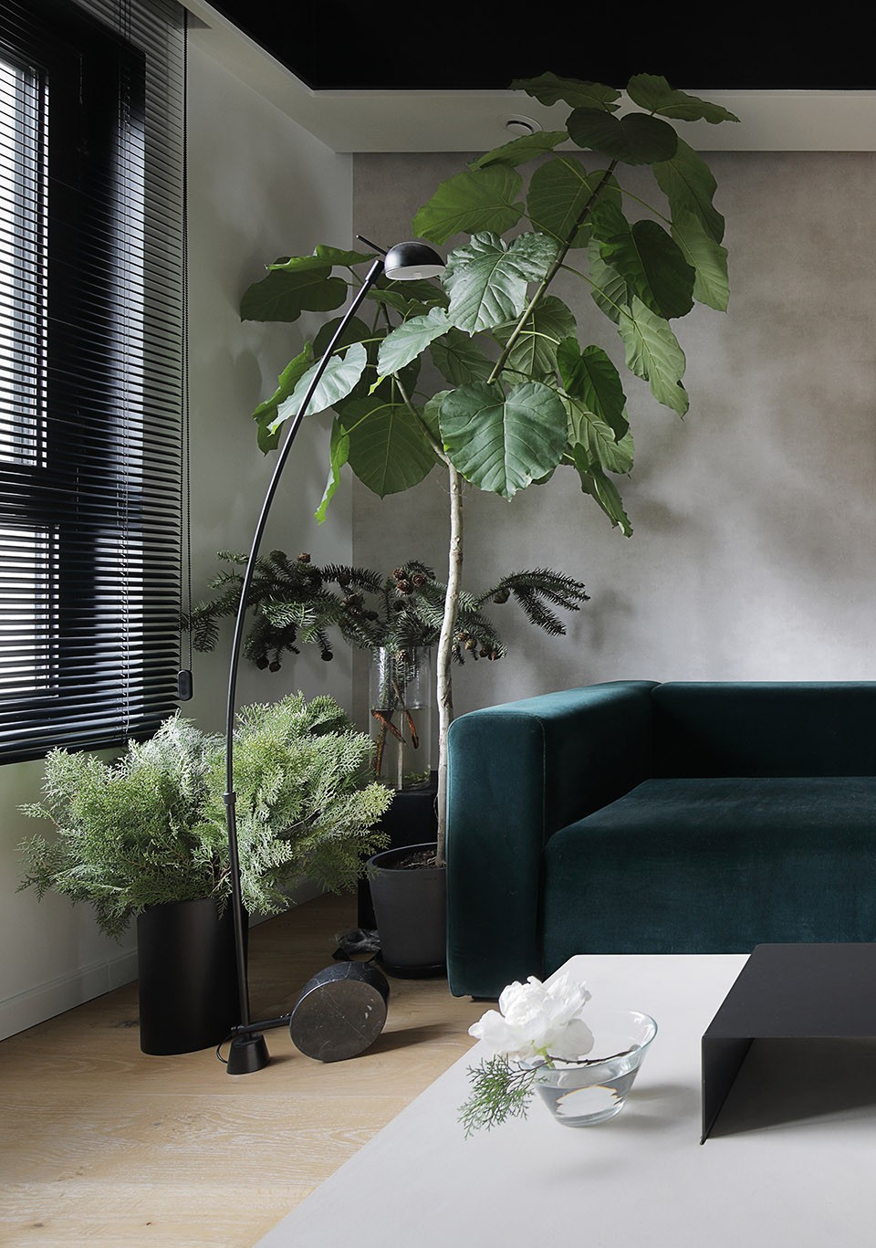 黑白基调加硬朗直线条的客厅,用地板的暖木色、壁炉中跳动的火,和生机盎然的绿意来柔化空间,要极简也要生动。
