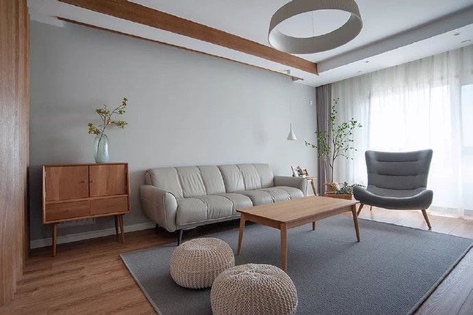 客厅的原木给人一种干净素雅的感觉,整体客厅的搭配以灰色调为主,展示了日式风格的休闲主题。