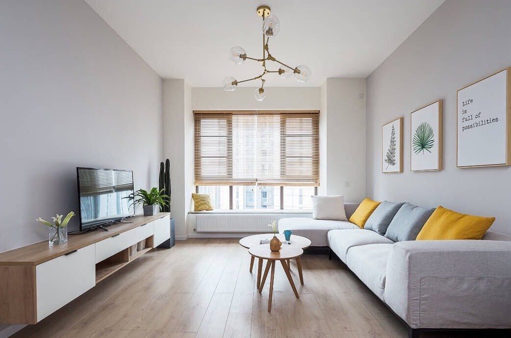 整个房间以暖白和原木色为主调,客厅采用了时下最流行的没有吊顶的设计风格,稍加金属质感的灯具和软装房间更加现代。