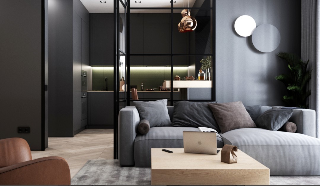 浅色的木质元素与黑灰色的家具形成了鲜明的色彩对比,明与暗的交织带来了时髦与质感的视觉感受。