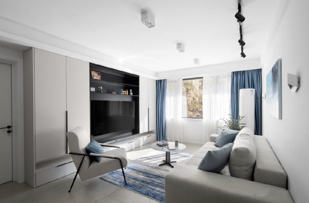 客厅无主灯设计已经够赞了,没想到还有蓝色的点缀更是直击人心。地面的线条纹理地毯,则是让空间更加清新舒适