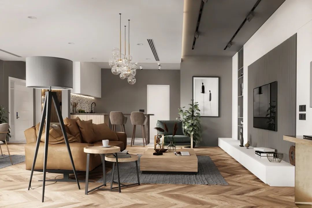 整个空间结合原木、水磨石、玻璃、皮革、布料等等多种不同的材质,创造出丰富的层次提升视觉效果,采用简约现代风格营造出一个高级而宁静雅致的灰色空间。