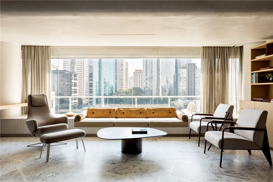 靠窗位置加上坐垫和靠背 设计成三连坐的沙发椅 大面积的玻璃幕墙将室外美景引入 成了最丰富的背景设计