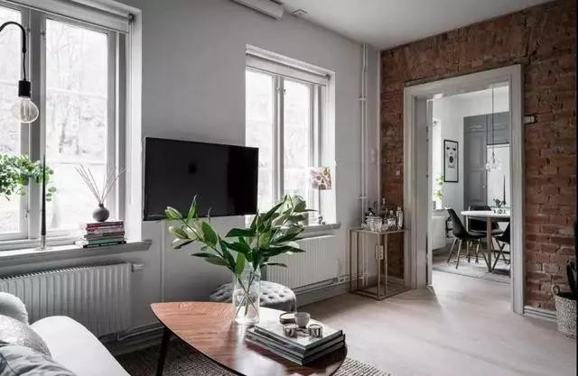 有两扇窗户,所以采光也很好。电视机被直接安装在了两扇窗户中间的墙体上,虽然没有正对沙发看起剧来有些不方便,但没办法,这样的布局才不会影响过道的通畅。