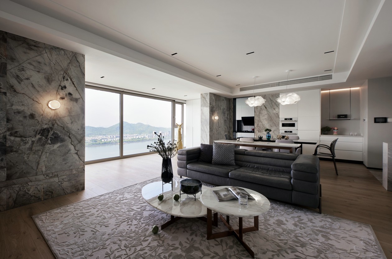 室内以纯净的白色调墙面,搭配自然风的木质地板,灰色调的沙发、地毯、石材,塑造出层次感丰富的灵动空间。