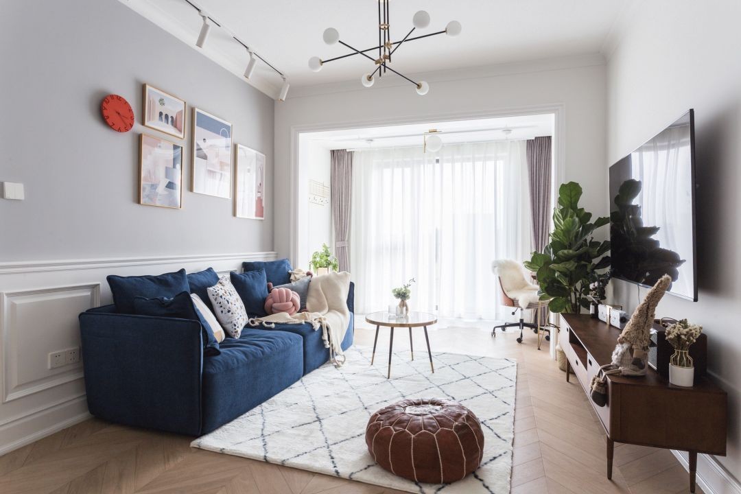 客厅主要以白色和灰色为主,沙发背景墙采用了灰色涂料漆+白色护墙板的搭配,让原本简洁的客厅多了一些美式的味道,整体看起来会更加轻奢一些。