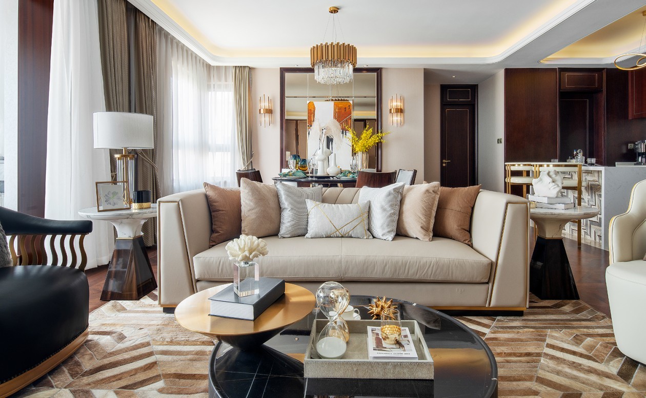 客厅、餐厅、水吧空间相互交融,我们把软装融入整个大场景中,随处充满生活的浪漫,美好即在当下。