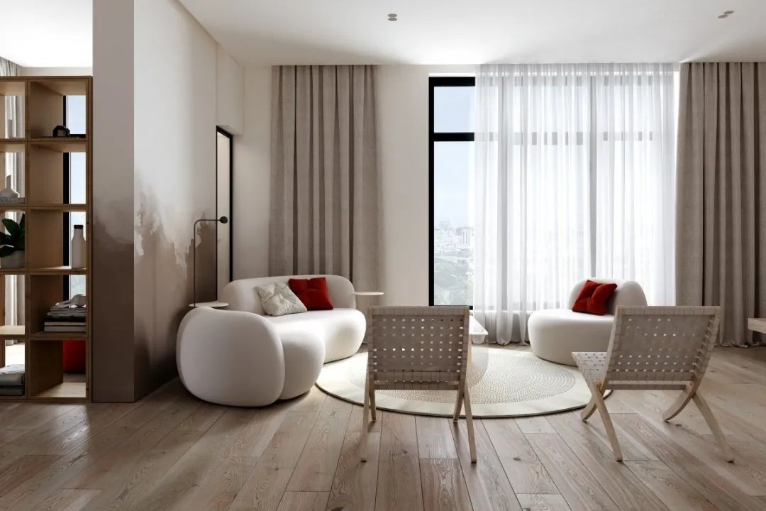 围合型客厅格局使人和人之间的距离更加亲近,通过编织藤椅在客厅的空间内形成围合的形态,不用考虑电视的存在,任意一面墙都可以作为投影使用。