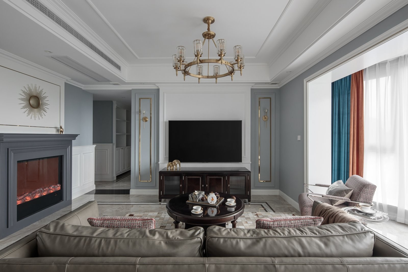 太阳造型的金属墙饰与壁炉的搭配恰到好处,产品本身的色彩不会过于张扬,但又在美式风格基础上融入现代时髦感,点到为止的设计手法让它成为客厅空间的一个焦点。