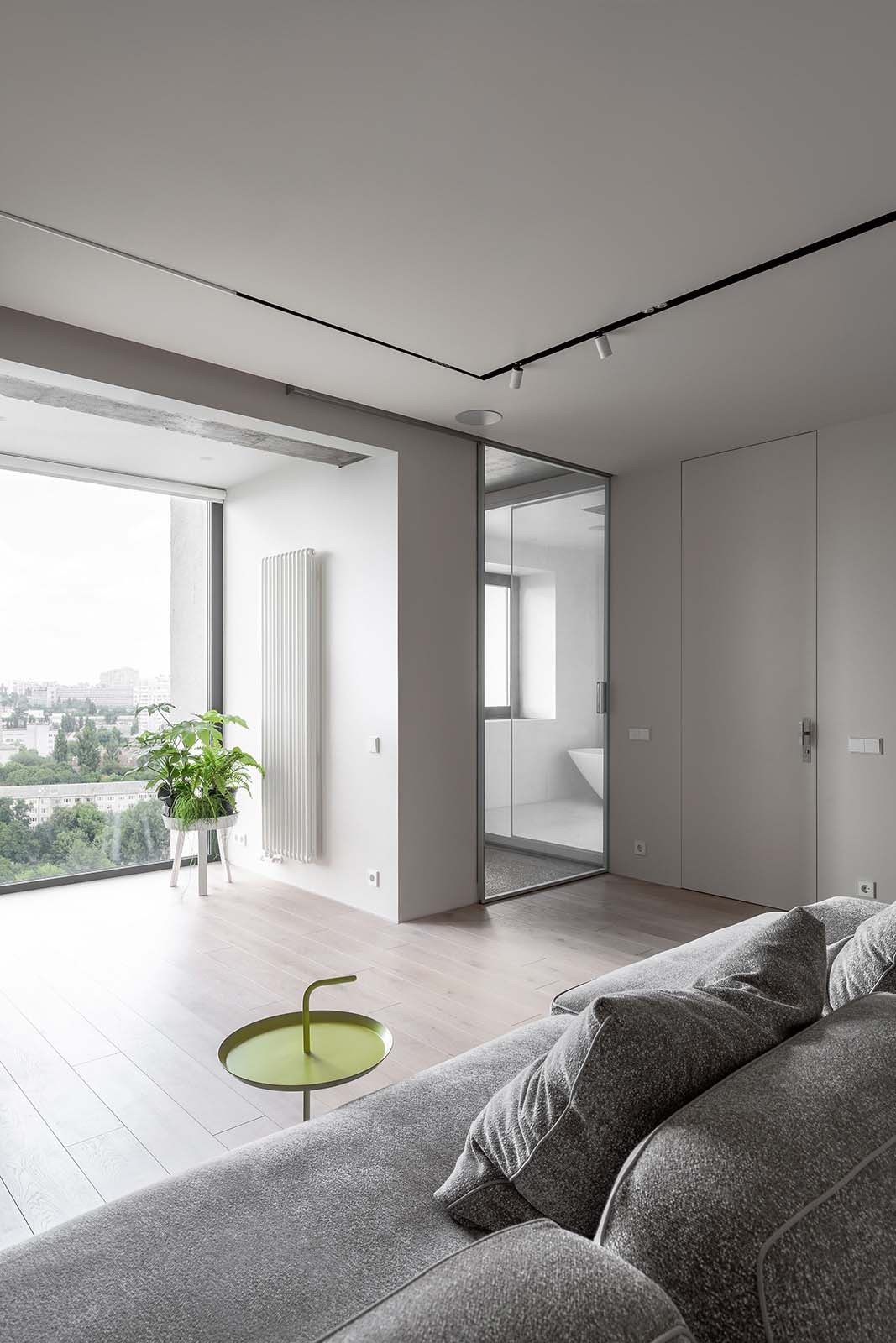 浴室配有Rimadesio的滑动镜门, 因此浴室的光线会突出客厅区域并照亮公寓的北部。
