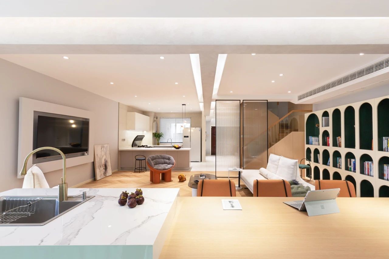 改造后,将小梁全藏在了吊顶内,只裸露出2个粗壮的主梁,主梁表面刷了仿水泥艺术涂料,围绕大梁两侧设计了反光灯带,营造出一种轻工业的氛围。