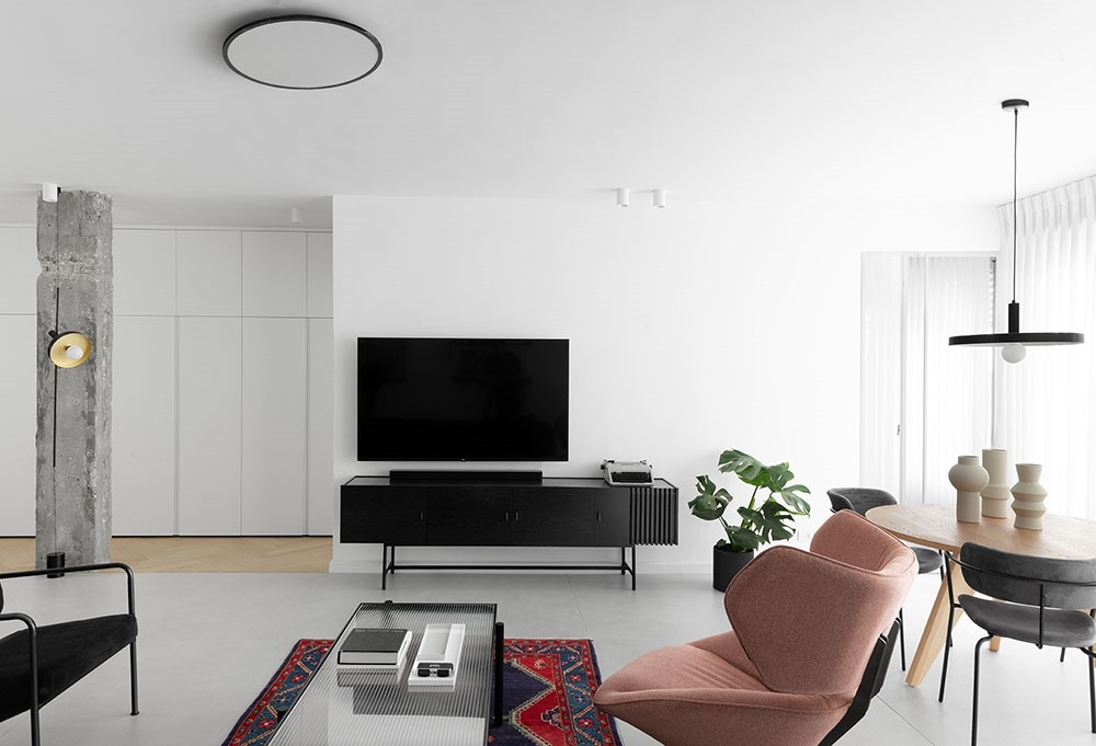 业主和设计师不约而同地选择了简约的白色饰面用裸露混凝土柱和黑色家具灯饰中和过多的白色