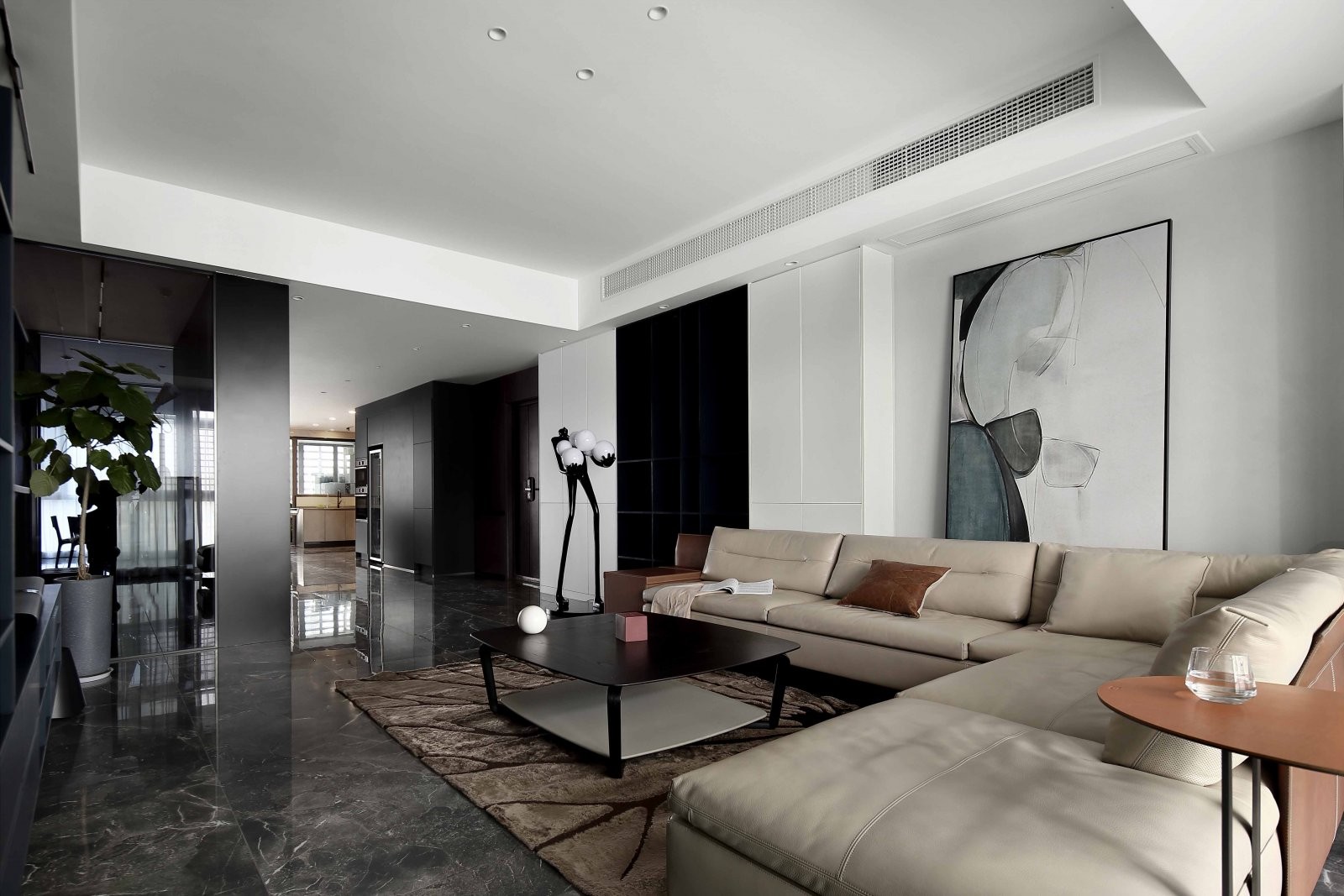 本次空间设计经过我们和居者的仔细推敲,整体崇尚洁简雅致,突出工艺和材质的审美品质,从而回应居者对生活质感的追求,宽敞舒适的客厅双向采光,通透明亮。不规则几何挂画,增添了些许自然之趣,打破了空间的沉闷感。搭配大地色简约家具,光感中隐约传达出美好的情境,优雅中富有变化,似有若无的韵律给人无限的遐想。