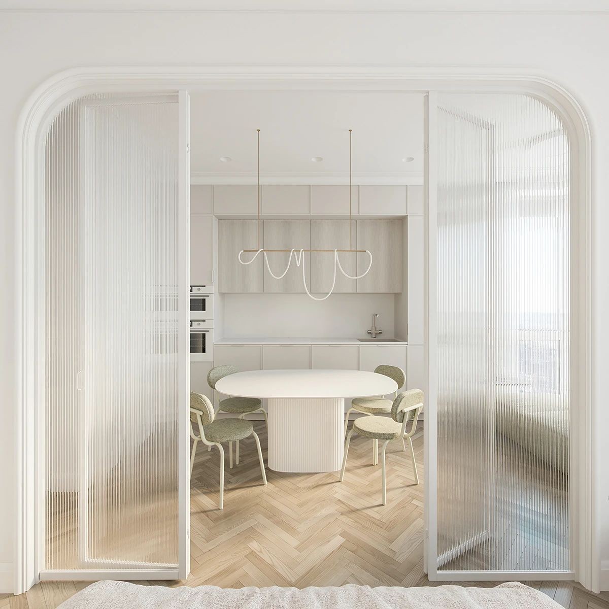 餐厅和厨房空间虽小但足够每一功能区都显得舒适有余,白色简约的餐厅搭配浅绿色的餐椅,白色的橱柜,窗外的光线与木质地板,为这里增添了活力与生机
