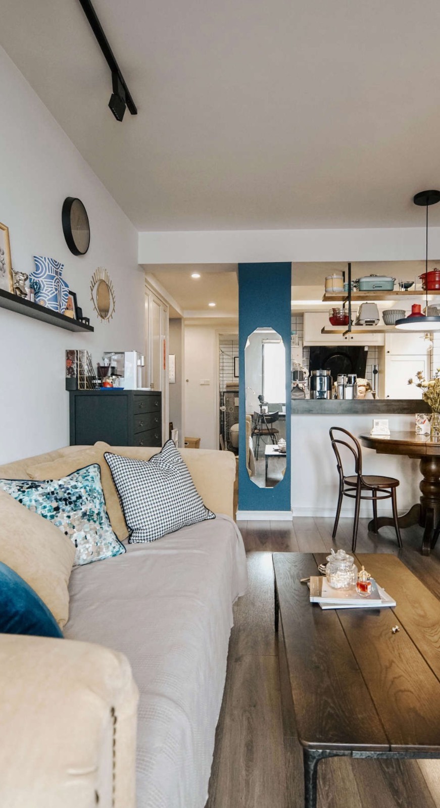 猫猫对蓝白调的偏爱,我们将空间整体的主调定位灰蓝白系,蓝色调的墙面点缀其中,温暖融合的暮色地板贯穿全屋。如此一来,简洁而稳定的底色搭配具有独特肌理的家具,让空间的质感更加丰富。 客厅沙发,能看清走廊动线和厨房餐厅一角。