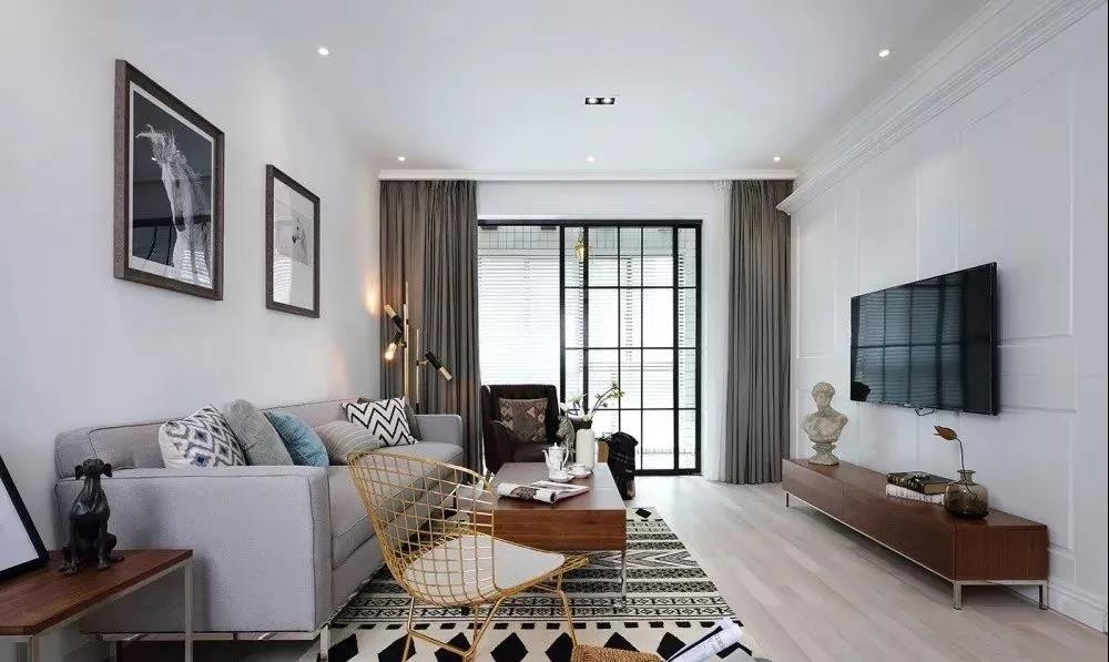 浅灰色的布艺沙发配上几何图案的抱枕、地毯,整体上舒适自然