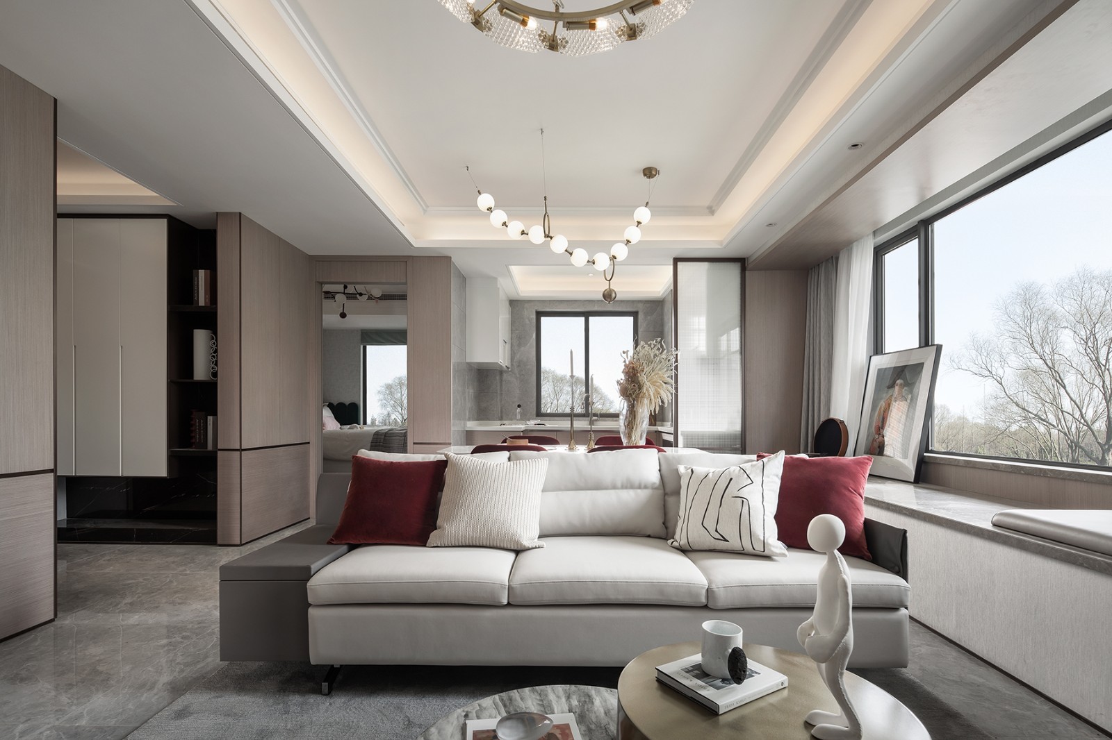吊顶现代,墙面护墙板尽显品质感,地面灰地砖,加上横厅采光充足,整个空间明亮而大气。