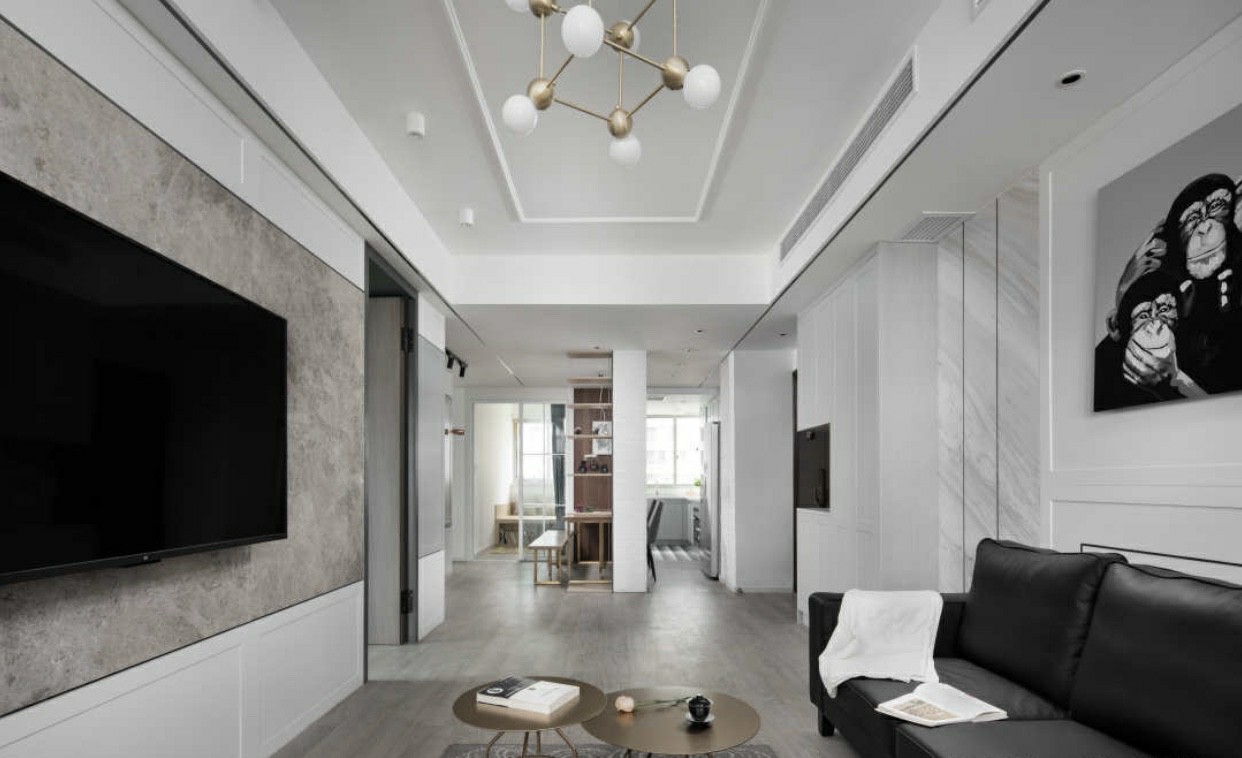 客厅以灰白色为主色调,局部调色做点缀