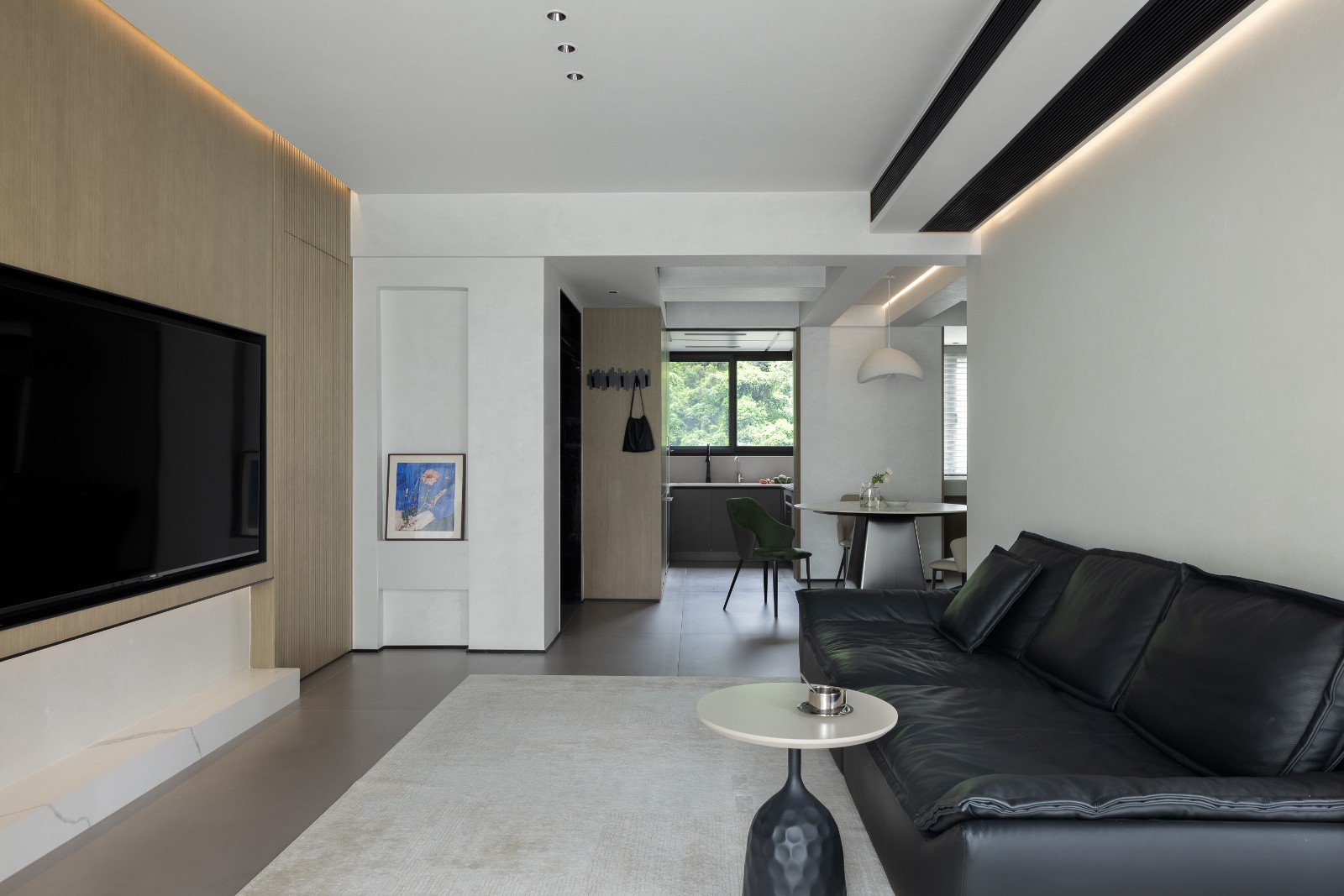 浅木色的墙面与黑色真皮沙发形成强烈视觉反差,却又因低饱和色调的调和而和谐统一。嵌入式电视墙隐于木饰面中,极简线条延伸出利落感;圆形边几以独特的几何造型成为视觉焦点,金属与布艺的碰撞,为空间注入一丝灵动。顶部的线性灯光与筒灯层次分明,在光影交错间,让整个客厅既显大气又藏细节,每一次落座,都是与质感生活的温柔相拥。