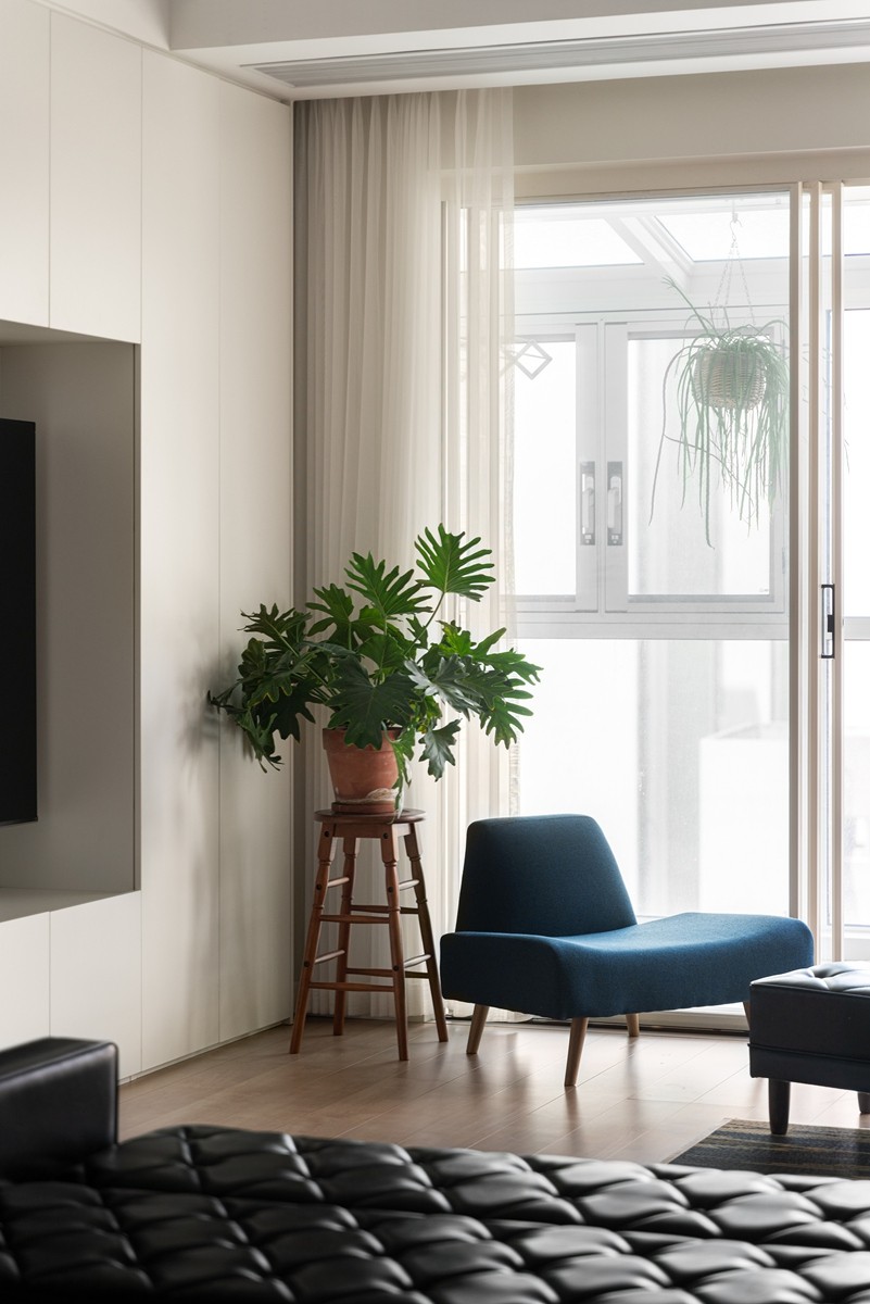 整面白色收纳墙利落大气,与原木地板的温润形成柔和对比。黑色皮艺长椅的复古质感碰撞灰调沙发的松弛,更有满室绿植如自然的笔触,将窗外天光引入室内,每一次归家都像一场与清新感的双向奔赴。