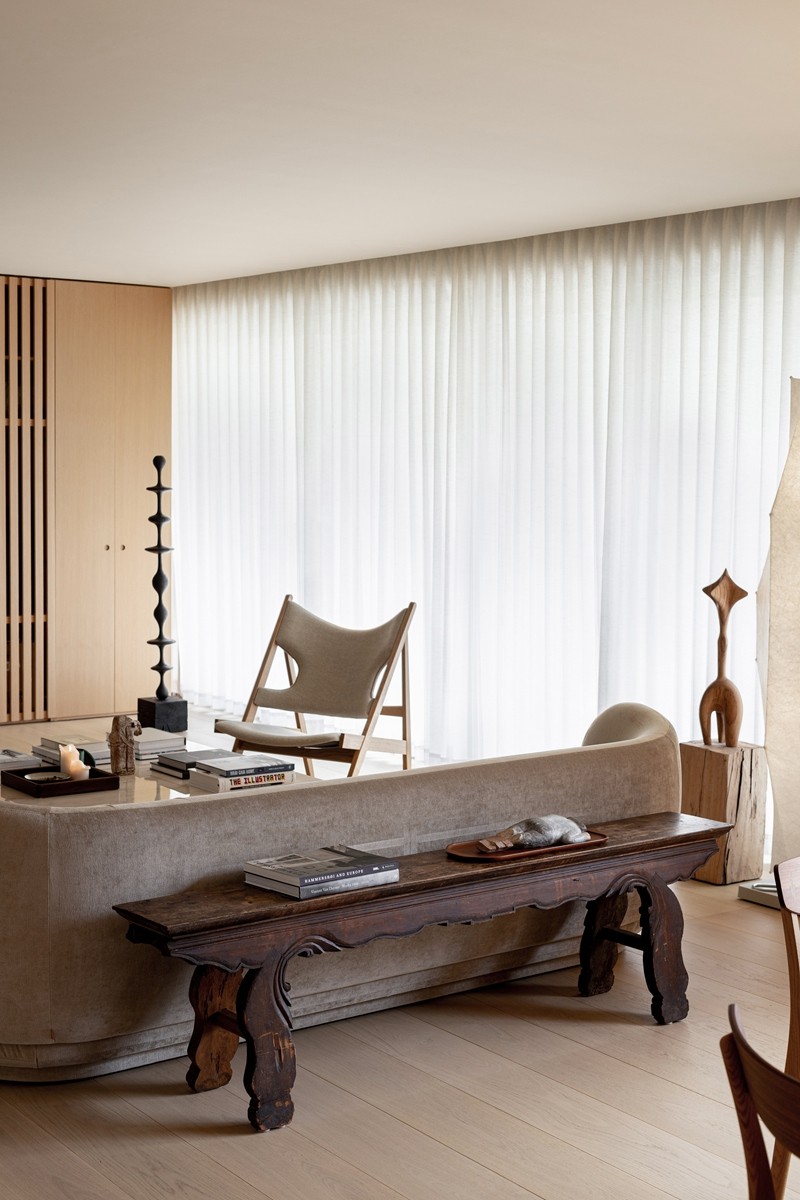 浅木色定制柜以“竖条格栅”的细节打破单调,如东方屏风般隐现雅致;奶咖色弧形沙发在原木地板上舒展慵懒,复古木质端景台与艺术摆件的组合,让空间成为“家的美术馆”。白色纱帘滤过的自然光,与轨道灯的柔和光晕交织,在极简中营造出“可静思、可欢聚”的松弛气场。