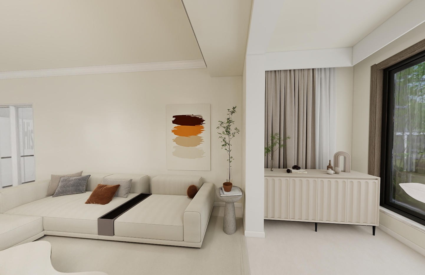 客厅细节处尽显雅致,沙发背景墙的艺术挂画为空间注入艺术氛围,旁边造型简洁的边几与绿植搭配,增添生机;
