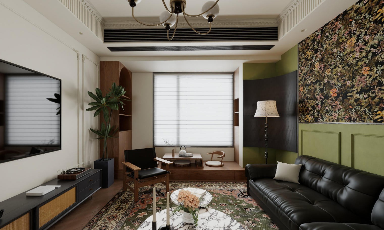 客厅休闲区以复古与艺术感为核心,黑色皮质沙发质感厚重,搭配复古花纹壁纸与绿色墙面,色彩碰撞间尽显个性。窗边打造出静谧的小休闲角,木质桌椅与绿植相互映衬,营造出放松的氛围;复古吊灯的光线洒落在花纹地毯上,使整个区域既具视觉冲击力,又充满舒适的生活气息。