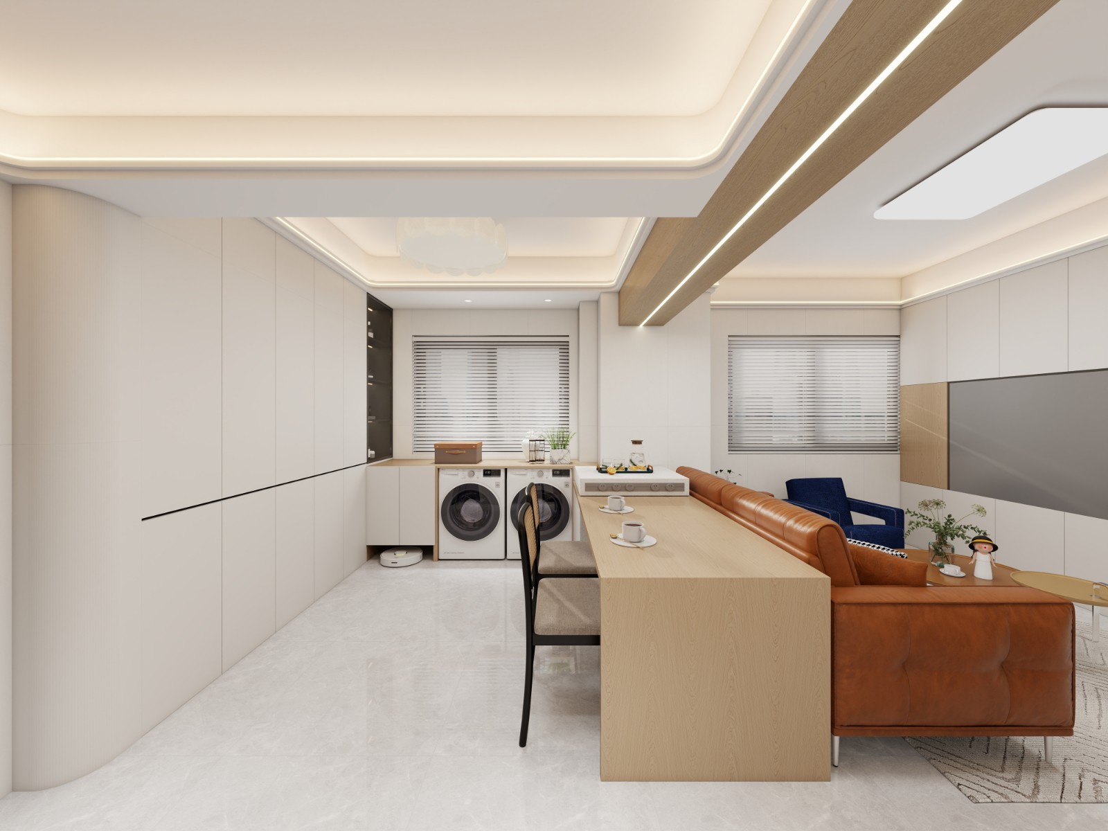 右侧打造L型电器地柜,具备强大的收纳功能,放置洗衣机,烘干机和扫地机器人。