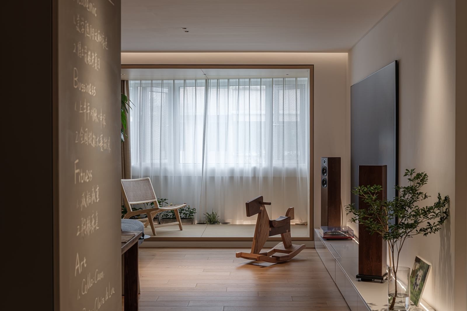 设计之初,我们就与屋主确定了客厅使用激光电视的方案,因此考虑激光电视和抗光幕布的距离问题成为首要的设计难点经过精密计算和反复加工,顺畅地连接智能设备,并配合场景变化实现全自动开启和隐藏的地柜设计,使得整个空间更为干净统一。
